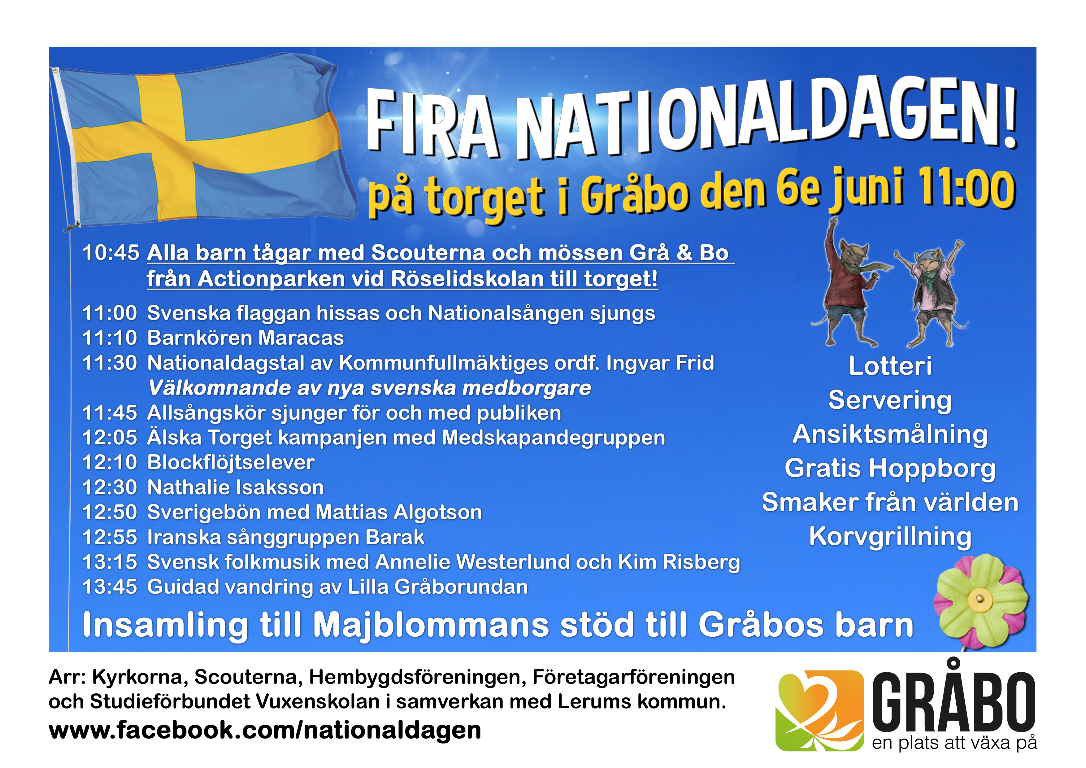 Vi inbjuder alla att fira Nationaldagen på torget i Gråbo. Med ett blandat program och med tal av Kommunfullmäktiges ordförande Ingvar Frid. I år har har Gråbo dessutom fått den stora äran att stå värd för Lerums kommuns första välkomnade av nya svenska medborgare.